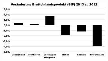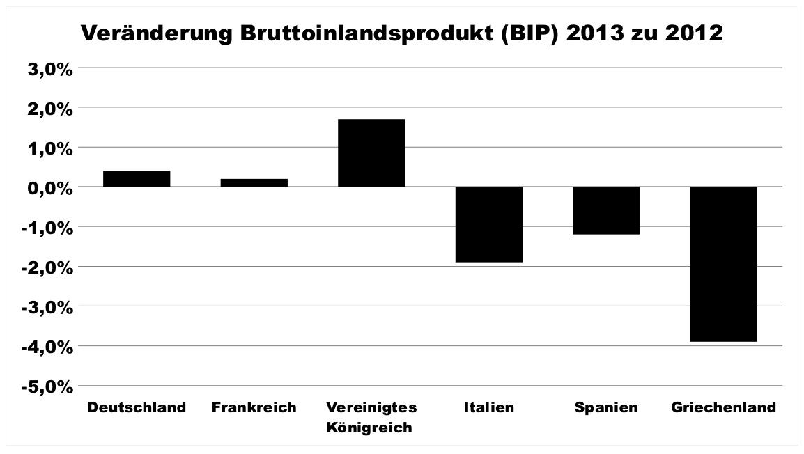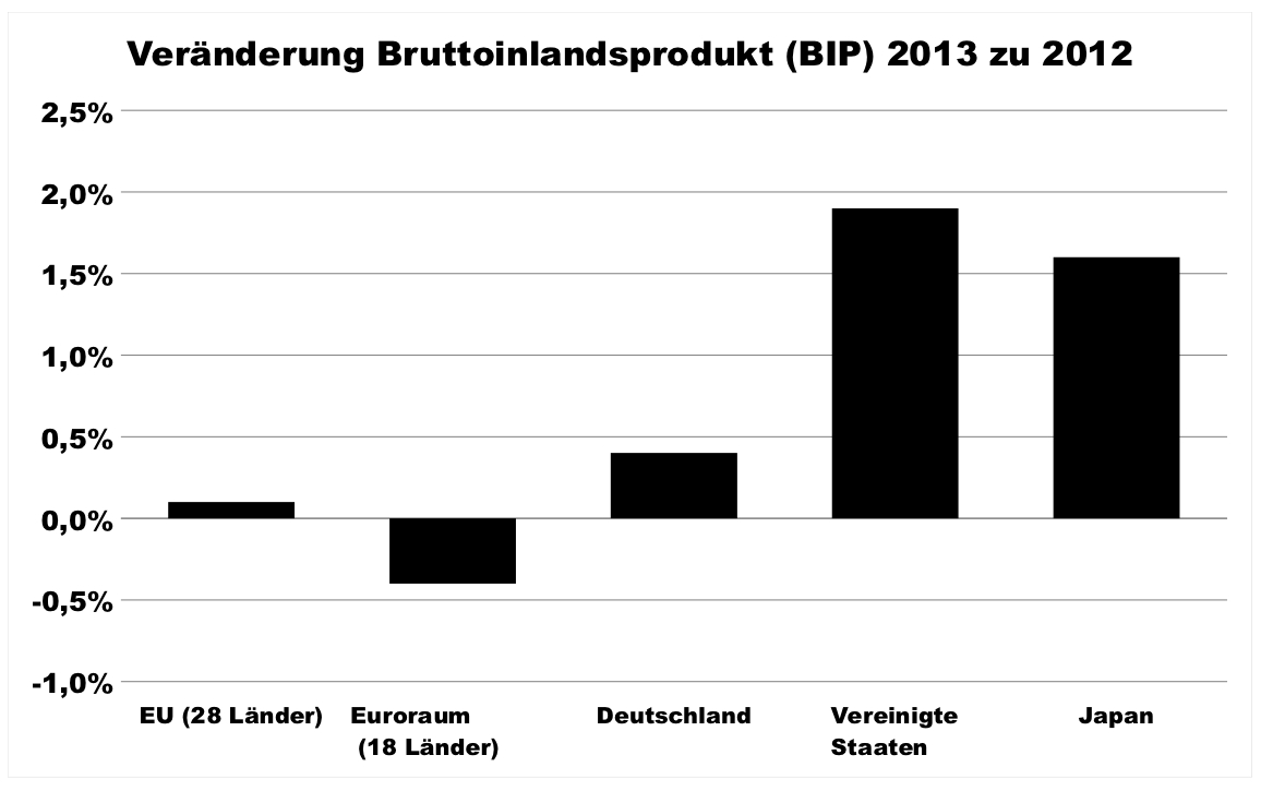 Das Gesamt-Bruttoinlandsprodukt in der EU war 2013 ein Nullwachstum, die Euroländer insgesamt waren zum zweiten Mal hintereinander rückläufig und liegen trotz der Ausweitung des deutschen Kapitals rund 2 % hinter der Gesamtleistung von 2008. Die USA und Japan verzeichneten hingegen (in der Definition vergangener Jahrzehnte) „normale Wachstumsjahre“. Letztlich zeigen die Daten die gleiche Tendenz wie bei den Investitionen.