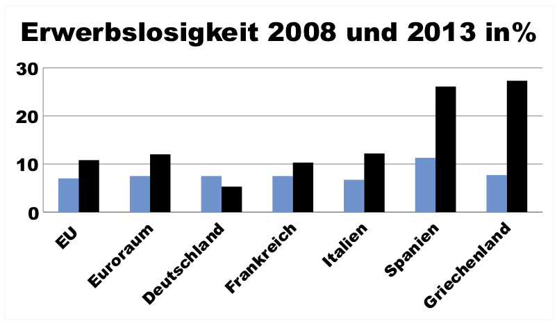 Die fortdauernde Krise zeigt in Europa auch hinsichtlich der Erwerbslosigkeit weiter ihr hässliches Gesicht: Während sich in der gesamten EU die Erwerbslosigkeit seit Krisenbeginn von 7,0 % auf 10,8 % deutlich erhöht hat, ist sie in Deutschland seit 2008 um rund ein Drittel zurückgegangen. In allen anderen EU-Staaten stieg die Arbeitslosigkeit seit Krisenbeginn an. In den hauptbetroffenen Ländern wie Spanien und Griechenland ist dabei eine Verdopplung oder auch mehr in den letzten fünf Jahren kein Ausreißer. In beiden Ländern gab es seit 2008 Jahr für Jahr eine Zunahme der Erwerbslosigkeit, auch 2013 wieder.