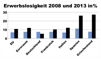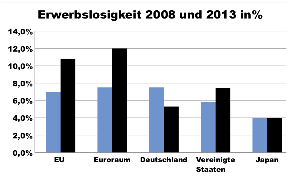 Im Vergleich zu USA und Japan liegt die Erwerbslosigkeit in der EU höher, sie ist aber seit Krisenbeginn auch zu den USA gestiegen. Im Euroraum ist sie wiederum nochmals höher als in der Gesamt-EU. Wie erwähnt bildet Deutschland dabei mit reduzierter Arbeitslosenzahl die einzige Ausnahme der EU.