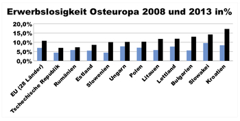 Die Arbeitslosigkeit ist in allen osteuropäischen EU-Ländern deutlich angestiegen. Wurde teilweise bis 2008 noch von „prosperierenden Reformländern“ geschwafelt, trifft diese die Krise nunmehr ebenfalls besonders hart. Lag die Erwerbslosigkeit in diesen Ländern 2008 noch leicht unter dem EU-Durchschnitt, ist sie in den vergangenen fünf Jahren um mehr als zwei Drittel angestiegen und bleibt jetzt nur noch in drei Ländern unter 10 %.
