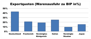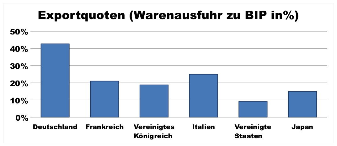 Der Vergleich der Warenexportquoten der imperialistischen Hauptländer verdeutlicht die extreme Abhängigkeit des Deutschen Imperialismus vom Warenexport. Die Option mangelnde Marktkapazität im Inland durch Absatz im Ausland auszugleichen, ist dabei auch seine Schwäche, denn der Absatz in anderen Ländern und Märkten muss immer auch neu erkämpft und abgesichert werden. Export heißt verschärfte Konkurrenz und entsprechende Auseinandersetzungen. Insbesondere der US-Imperialismus zeigt demgegenüber seine Stärke eines deutlich größeren Binnenmarktes im eigenen Land durch eine Exportquote von unter 10 % der Wirtschaftsleistung (BIP).