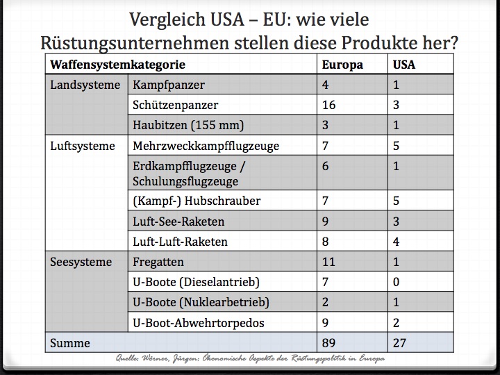 »Die Verteidigungsindustrie in der EU ist nach wie vor national ausgerichtet und stark fragmentiert. Europa leistet sich den ›Luxus‹ zahlreicher Programme für gepanzerte Fahrzeuge, den intensiven Wettstreit zwischen drei Kampfflugzeugen und eine starke Konkurrenz z. B. im U-Boot-Bereich. […] Folgen dieser unbefriedigenden Situation sind hohe Kosten und nachteilige Folgen für den internationalen Wettbewerb, aber auch negative Auswirkungen für die Streitkräfte. Die Bundesregierung muss daher nach meiner Meinung verstärkt auf eine europäische Zusammenarbeit bis hin zum Zusammengehen von in einzelnen Mitgliedstaaten ansässigen Unternehmen setzen.« (nach jW)