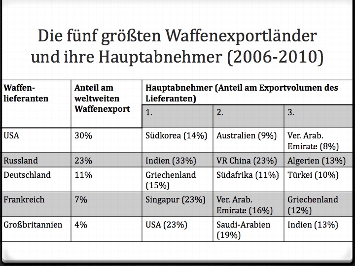 Und dann gibt es noch ein weiteres ökonomisches Problem der Rüstungsproduktion. Es handelt sich hier um Güter, die nur dann einen Gebrauchswert haben, wenn Krieg geführt wird. D.h. der Staat kauft das Zeug, aber im imperialistischen Frieden schimmelt es vor sich hin und wird erst erneuert, wenn es veraltet ist. Ganz zu schweigen davon, dass diese unnützen Waffenkäufe von den Arbeitern mit sozialer Demontage zu bezahlen sind. Der Absatz stockt also, das Kriegsgerät würde damit erstmal das Schicksal zum Beispiel einer großen Masse auf Halde liegender Autos teilen, die keiner mehr kaufen kann oder will. Die Überproduktionskrise wird dadurch noch verschärft. Teilweise wird das Problem durch den Export von Waffen geregelt. Damit werden aber auch die hier genannten Probleme exportiert. Dazu ist anzumerken, dass Griechenland der größte Abnehmer deutscher Waffen ist. Damit ist Griechenland auch eins der anschaulichsten Beispiele, wie sehr der deutsche Imperialismus mit dem Waffenexport seine Einflusssphären erweitern kann.