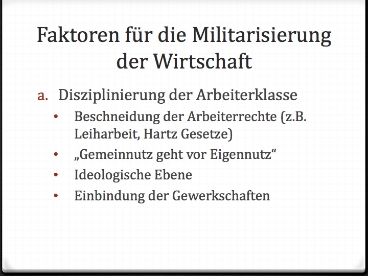 Man muss sich klar sein, dass die Disziplinierung der Arbeiterklasse im Gange ist, wir aber keineswegs schon eine Kriegswirtschaft haben. Der freie Lohnarbeiter existiert noch, auch bei Hartz-4-Schikanen, Leiharbeit, Werksverträgen, befristeten Arbeitsverhältnissen, Kriegsgeschrei der Gewerkschaftsführer usw. usw.