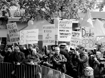 Wenn es darum geht, in diesem Sinne für Verwirrung und Desorganisierung in der Klasse zu sorgen, ist es z.B. bei der IGM üblich, dass der Vorstand die IGM-Grundsatzabteilung an die Front schickt, um Grundsätze zu ändern. Nur zur Erinnerung: In ihrem Referat hat Genossin Erika im vergangenen Jahr hier auf der Hauptfeindkonferenz unter der Fragestellung „Wie kommen Arbeiter zur Vaterlandsverteidigung?“ wichtige Punkte zur Rolle, die die Sozialdemokratie dabei spielt, ausgeführt. U.a. ist sie hierbei auf die 1994 von der IG Metall-Führung erfolgten Angriffe auf die eigene Bildungsarbeit eingegangen. Auftragsgemäß wurden sie von der IGM-Grundsatzabteilung mit dem Ziel geführt, Vertrauensleuten, Betriebsräten und Belegschaften den bisher als grundsätzliche Erkenntnis vermittelten unversöhnlichen Interessengegensatz zwischen Arbeit und Kapital auszutreiben. Nach Meinung der IGM-Grundsatzstrategen hat das ein „bipolares Denkengefördert“, welches den Blick für gemeinsame Projekte mit dem Kapital verstellt und vor allem eine „intelligente Kapitalismusanalyse“ verhindert hat.